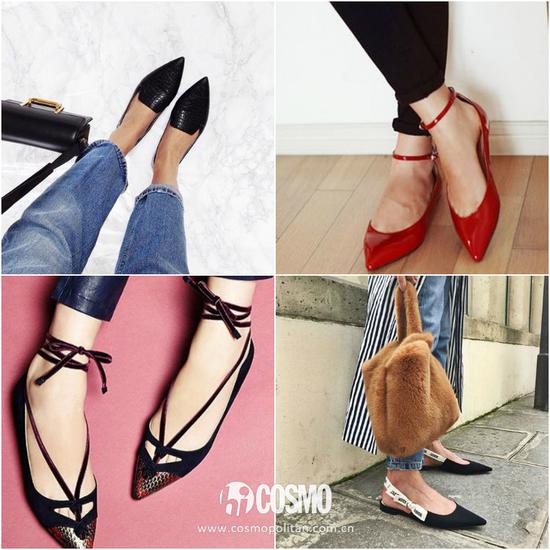 尖头平底鞋拉长腿部长度也更加明显,尖头平底鞋的尖头部分,其实就下意识的在视觉上延伸了腿部的线条。