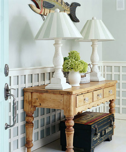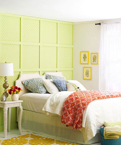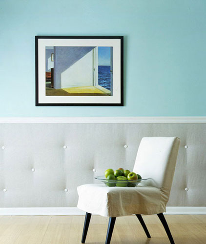 通过木板和织物装点墙面,先将护墙板固定在一个高度,在填充上泡沫塑料或者是棉花,再装饰上好看的布料,钉上纽扣,立刻就让前面独特起来。