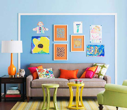 家中孩子的绘画作品总是不少,那就利用这些绘画成为装饰墙面的元素,展示孩子最喜欢的作品。制作一个大大的墙框架,中间涂成蓝色,错落有致的摆放上孩子的绘画作品。