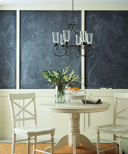 直接将墙面涂成黑色,成为一块黑板,在黑板上描绘上曲线的粉笔线条,使这个空间呈现出小酒馆的味道。在墙面上还摆放上小粉笔和小黑板擦,可以随时改变图案,趣味十足呢。