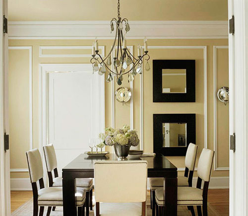 在餐厅一旁的墙面,通过将镜子和边框线的有效结合,呈现出独特的变化感,通过狭长型的边框处理,具有拉升墙面的的视觉效果。
