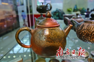 记者在现场近距离观赏吴金维的作品,发现不管是茶壶、茶罐、茶托和茶杯,尽管没有上釉,但件件都能不同程度地体现出一般在瓷器身上才可能出现的流光溢彩的 美学特征,除了独家的金、银之外,还有红色、橘色,有些茶器身上,还能看到细腻的蓝、紫、黝黑渐层,所有作品都能够明显看到高温变化的火痕,而器皿表面的 肌理则千变万化,有鱼鳞纹,也有蜘蛛细纹,还有亮丽的闪光,器皿胚体迎火面上所聚积生成的落灰、结晶花。