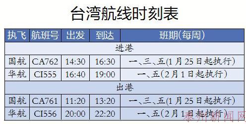 据悉,本次首航到达旅客140人,出发旅客142人。华航执飞的台北航班机型为波音B737-800,班期为每周周一和周五,进港航班号为 CI555,16:40从台北桃园机场起飞,19:00抵达扬州泰州机场。出港航班号为CI556,20:00从扬州泰州机场起飞,22:20抵达台北桃园机场。