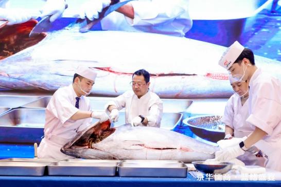最激动人心的庖丁解鱼环节,将现场氛围推向顶峰。姜炳升先生凭借数十年沉淀的精湛技艺,以刀为笔,以鱼为纸,演绎着力与美的极致融合。第一刀取“大腹”,大理石纹理般细腻的肉质中,脂肪如霜花绽放,是蓝鳍金枪鱼的至高恩赐,寓意着人生与事业丰饶润泽;第二刀取“中腹”,脂肪与肌肉的比例恰到好处,醇厚中透着轻盈,恰似儒商之道,圆融而有气节,心怀兼济天下之志;第三刀取“赤身”,紧实绯红的肉质凝结着深海力量,象征着儒商立足之本的诚信、专注与初心。每一刀都精准利落,每一处分割都彰显匠心,让现场嘉宾无不惊叹于传统技艺的深厚魅力。