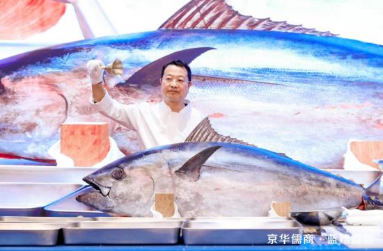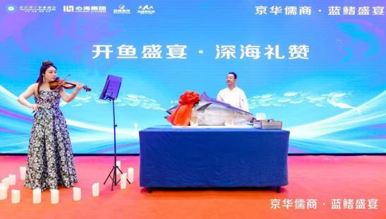 在开鱼仪式正式启动前,优雅的舞蹈艺术家、音乐人安珉萱女士登台献艺,悠扬婉转的小提琴旋律在厅内回荡,为这场深海盛宴拉开序幕。当高雅艺术邂逅深海珍馐,独特的碰撞惊艳全场,让嘉宾们在味觉盛宴开启前先享受到一场听觉的熏陶。随后,全场以热烈的掌声,有请被誉为“蓝鳍姜太公”的日料泰斗、北京江户前餐饮有限公司董事长姜炳升先生携专业团队登台,呈现这场庄严而绚烂的开鱼盛宴。姜炳升先生上台后向嘉宾致意,分享了与心海集团、济宁商会的合作初心,表达了对蓝鳍雅集未来发展的殷切期待。