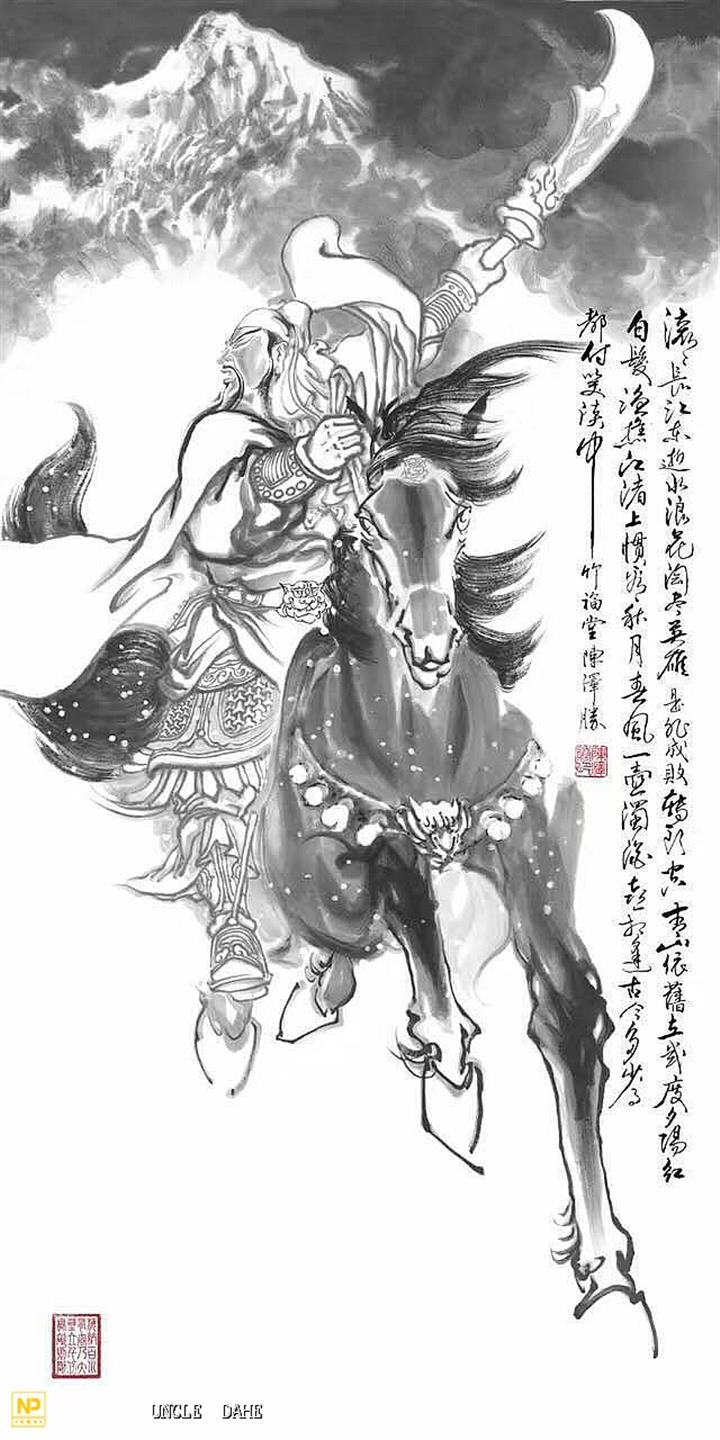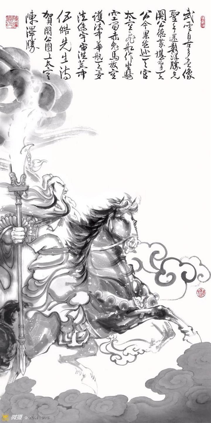 陈泽胜先生是中国当今擅长画关公的画者,作为一名艺术家,画关公不是单纯追求绘画技巧,而是发自内心对关公重德行义高尚精神的崇拜与敬仰。所以,他笔下的关公从来都不是血雨腥风杀伐征战,而是德耀寰宇炳千古,人格立世、德义擎天,止戈为武的武圣!按照中国民间信仰的说法,关公是“真武大帝”,是整个宇宙的护法,近百年关帝更是天上执星宿代行玉帝职能,护佑着天地的和平与安宁。这也启迪我们,什么才叫“真武”?“真武”绝非穷兵黩武,“真武”是不战而屈人之兵的仁义之师、正义之师!