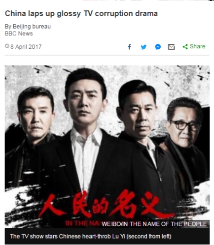 报道描述了中国老百姓们“全民追剧”的盛况:“反腐电视剧《人民的名义》受到了广大中国老百姓的喜爱,不过年轻一代网友更喜欢用段子和表情包来表达他们对这部剧的喜爱。”