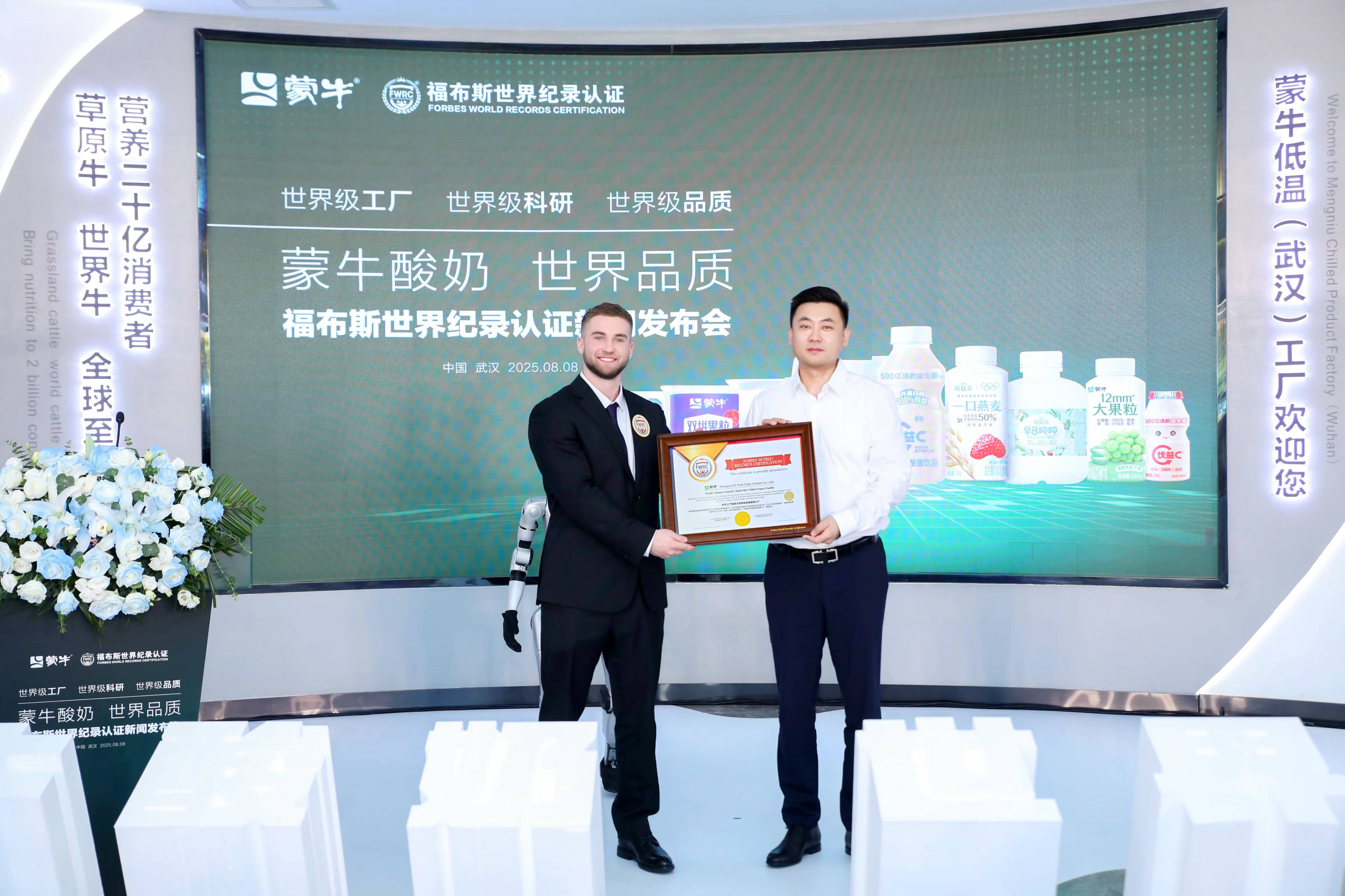 发布会上,FWRC福布斯世界纪录认证官本·科特正式宣布蒙牛低温武汉工厂荣获“世界上产能最大的单体低温酸奶工厂”认证,并现场颁发证书。该项权威认证不仅是对其世界级规模与智能化水平的充分肯定,更是中国乳业以创新驱动发展、引领新质生产力建设的里程碑式成就。