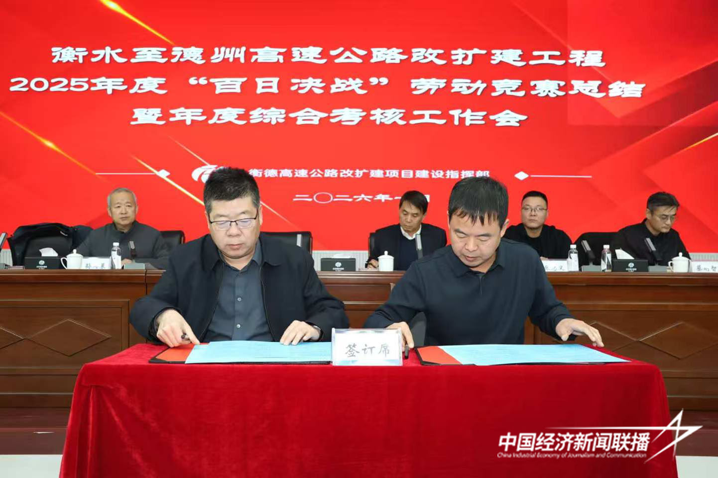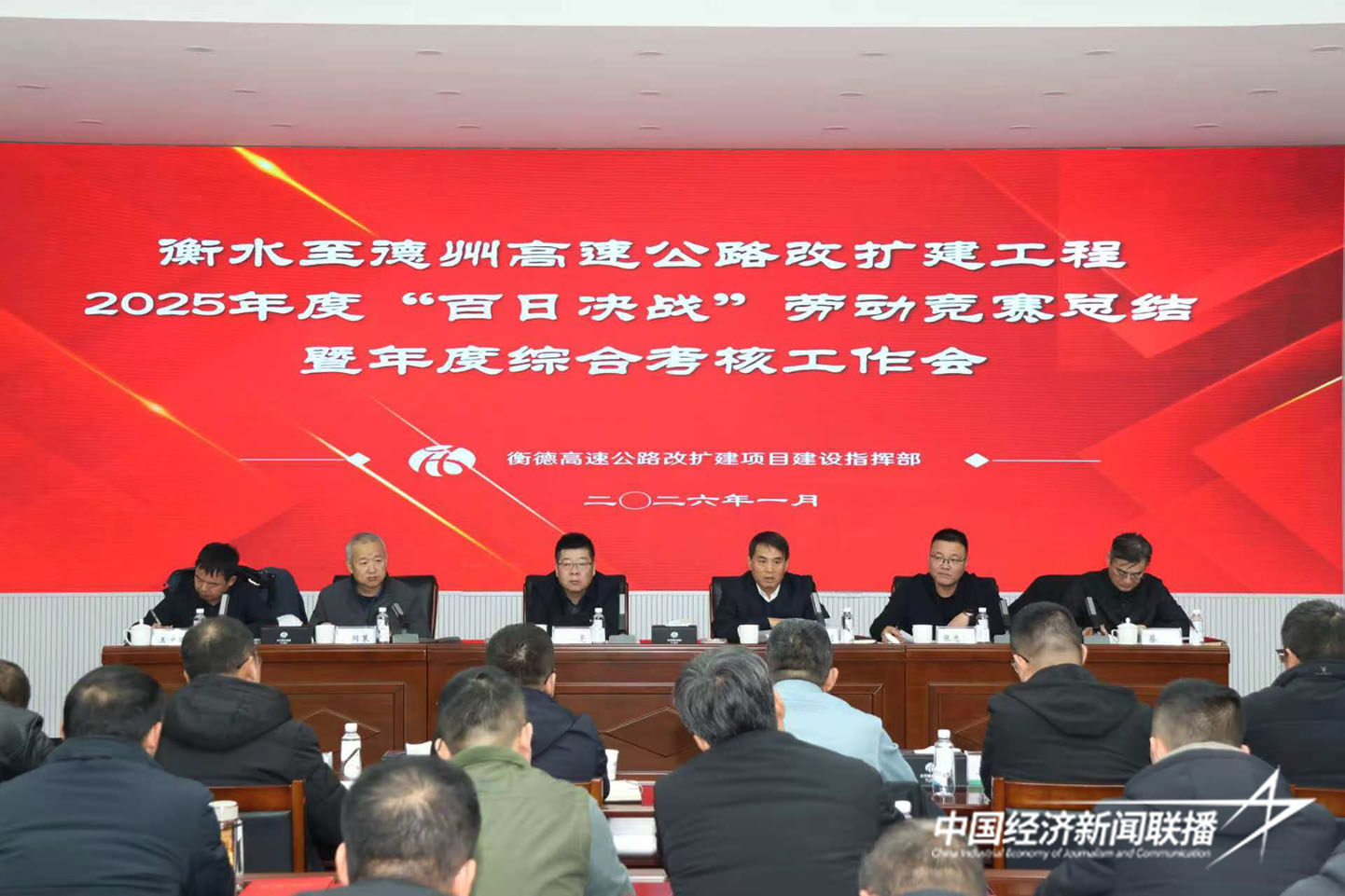 中经联播讯 2026年1月13日,衡德高速公路改扩建项目召开“百日决战”劳动竞赛总结暨年度综合考核工作会,全面总结2025年工程建设成果,表彰先进集体与个人,并部署今冬明春各项任务。指挥部领导班子、各部室负责人及相关人员,各参建单位负责人及先进个人代表参会。