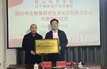 签约仪式上,鞍山师范学院相关负责人阐述了基地共建思路,强调将依托岫岩玉文化这一“活态文化载体”,聚焦国际中文教育研究生的文化传播与实践创新能力培养。其间,鞍山师范学院与辽宁省岫岩玉产业开发区签订《国际中文教育研究生文化实践教学基地共建合作协议》,鞍山师范学院代表为岫岩玉产业开发区授予“国际中文教育研究生文化实践教学基地”牌匾。