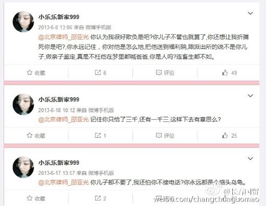 知名博主“长春国贸”通过微博曝出一些关于疑似邵亚光相关信息。一位名为“小乐乐新家999”的网友长期在微博中和邵亚光“撕逼”,称邵亚光不管儿子,将儿子送到福利院,并跟警察称不是他儿子。