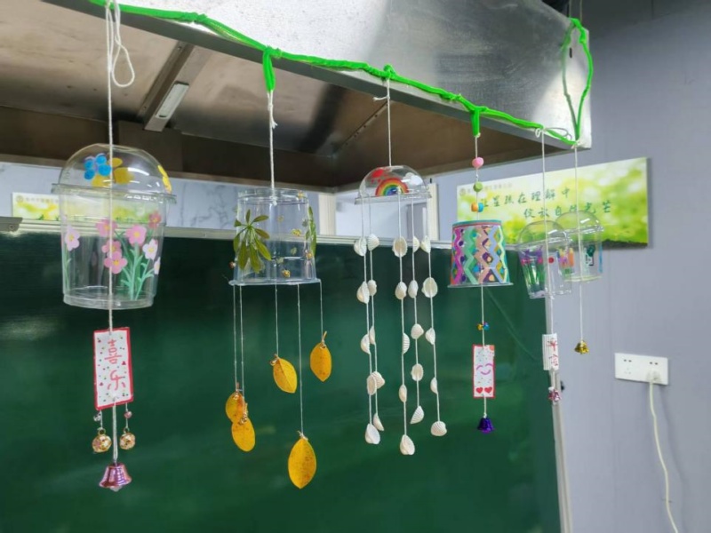 活动现场,奶茶杯、贝壳、彩色小铃铛、丙烯马克笔、扭扭棒等材料整齐陈列,一件件朴素的物料,静待着孩子们赋予其独特生机。考虑到孤独症孩子动手能力较弱,志愿者全程一对一耐心陪伴引导。孩子们慢慢拿起丙烯马克笔,在奶茶杯壁上一笔一画勾勒线条;学着将扭扭棒弯折缠绕,做出可爱的小造型;再把彩色小铃铛和打磨好的贝壳精心搭配、粘贴,将藏在心里的奇思妙想,一点点呈现在风铃之上。