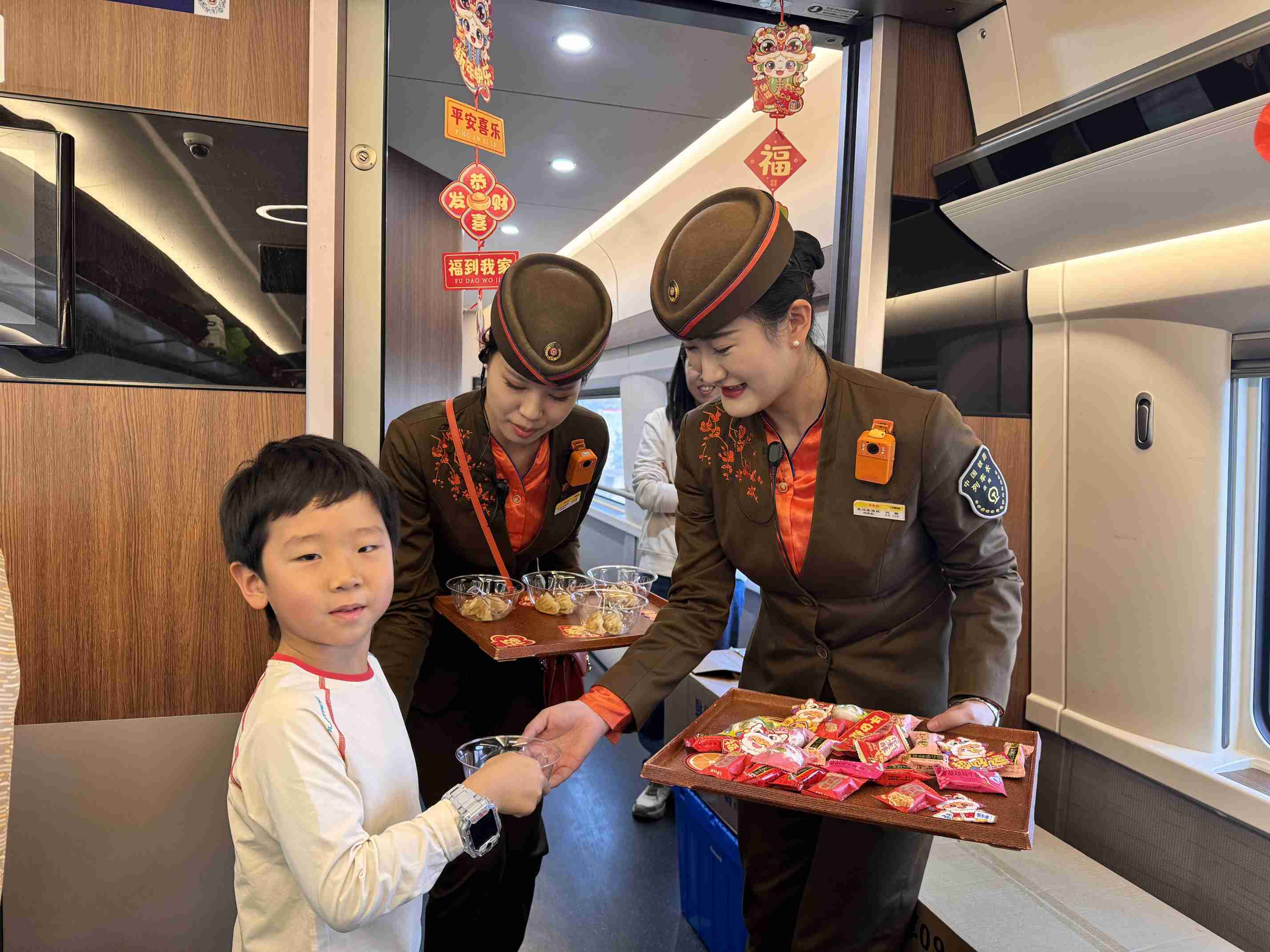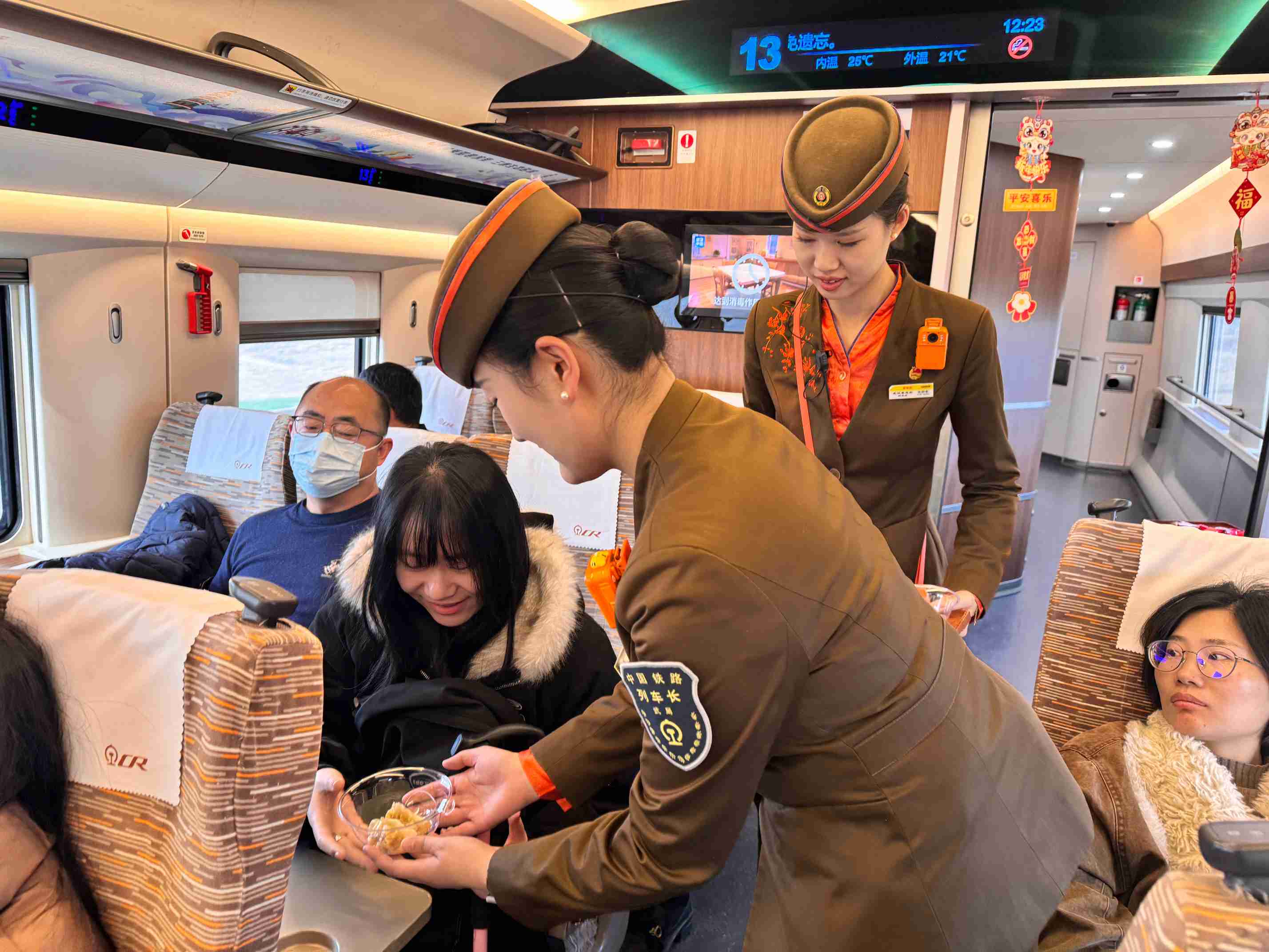 随后,列车工作人员们逐节车厢为旅客送上热腾腾的美食,“小朋友,冬至安康,我们准备了水饺和糖果,祝你健康成长”。温柔的问候伴着暖心的美食,瞬间拉近了与旅客的距离。旅客们纷纷表示,虽然出行错过与家人围坐在一起团圆,但是在列车这个流动的大家庭里吃上饺子也是别有一番风味。
