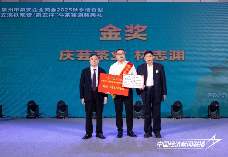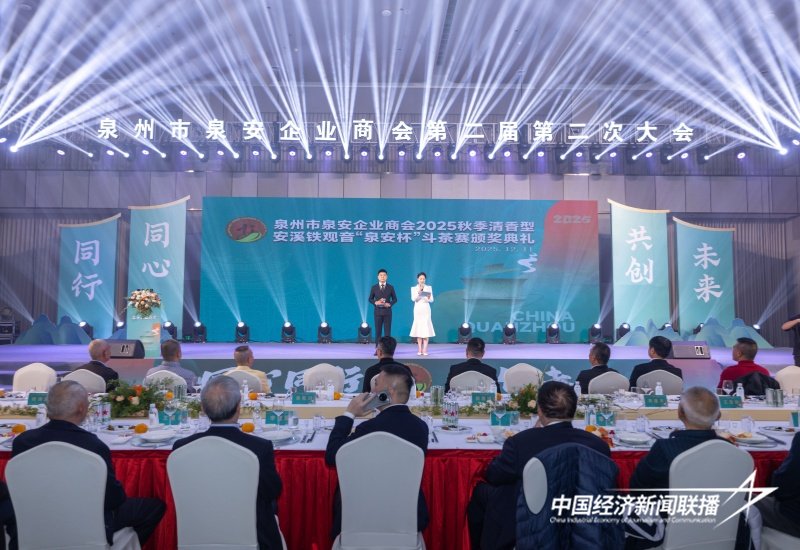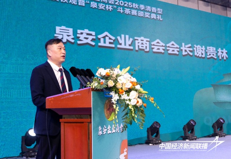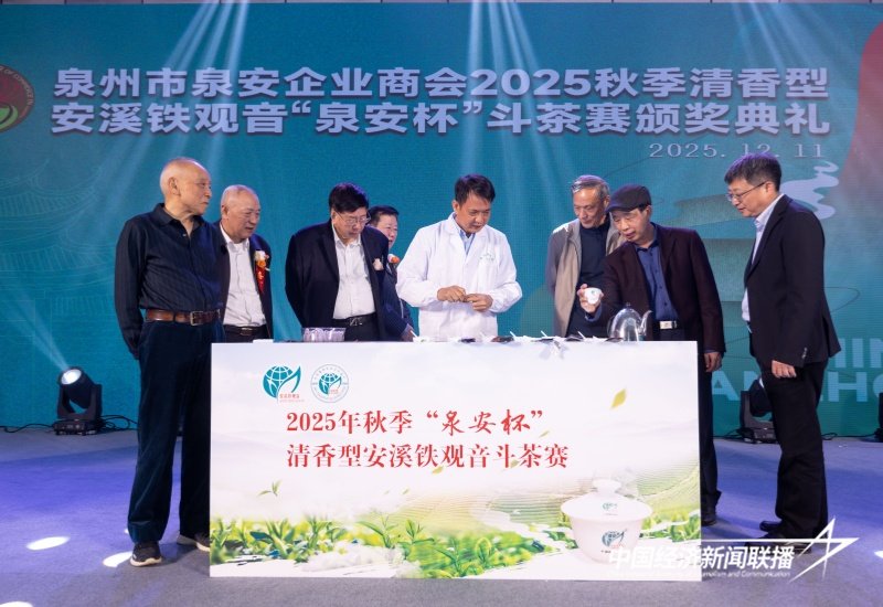中经联播讯(庄秋风 马海彤 通讯员 王灿玲 黄东华)12月11日,2025年秋季“泉安杯”清香型安溪铁观音斗茶赛颁奖典礼在福建泉州举行。福建省人大常委会原副主任、海峡两岸茶叶流通协会高级顾问庄先,泉州市人大常委会副主任、市企业与企业家联合会会长高向荣,安溪县领导刘永强、肖印章、邱志民、吴振法等出席活动。
