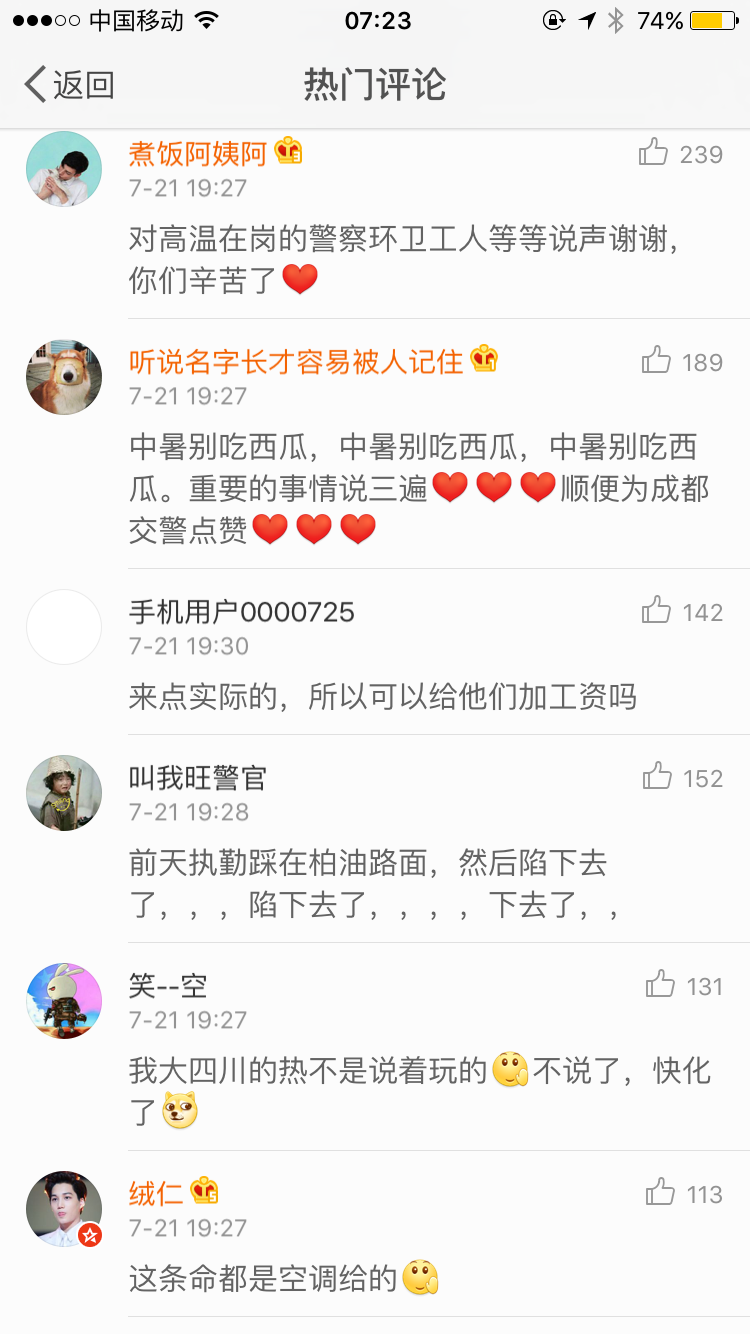 随后,@平安成都 又更新一条微博,配图不仅有早前连长,还有更多奋斗在一线的执勤警察照片,并配文称:“7月21日至24日,G20财长和央行行长会议在成都举行。围绕G20成都会议,超900人的嘉宾代表、成都的国际范儿、成都越发便捷的空中交通、高速发展的‘西部头羊’……除了这些高大上话题外,那些为了这场盛会,默默付出的普通人,也同样值得被书写!”