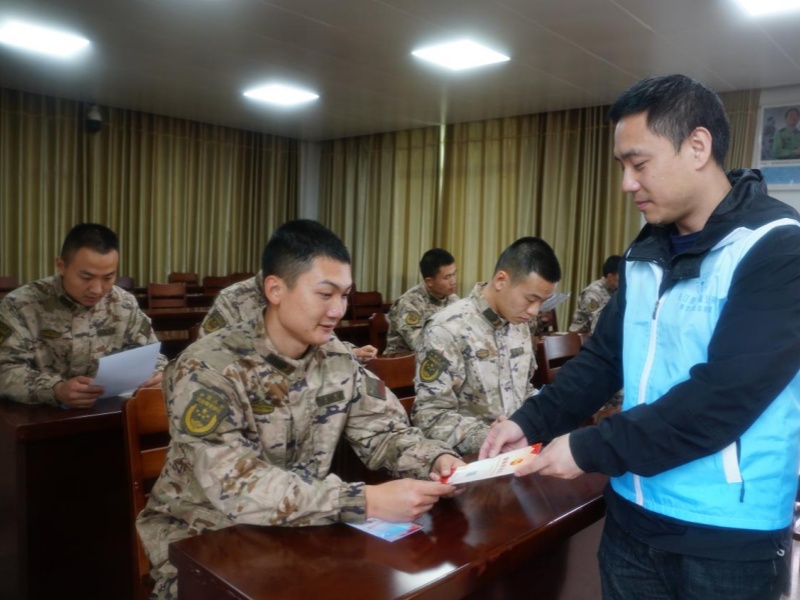 ▲“蒲公英”志愿者向武警官兵发放法治宣传资料