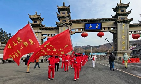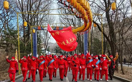 活动开始当天上午,参加登高活动的人集结完毕,现场劲歌热舞锣鼓喧天,为活动提前热身。定点抽老牛、双人冰车竞速、单腿驴竞速、雪地滚铁环、冰上毛毛虫等趣味性十足的冰雪项目也吸引大家热情参与。10时30分,伴随汽笛声响起,活动正式启动,浩浩荡荡的人流挥舞着旗帜,乘坐摆渡车抵达千山正门,然后徒步登山,与山峦形成了一动一静的精彩画卷。