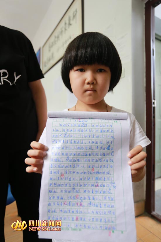 9月25日,遂宁市明月小学三年级语文老师批改学生作文时,被佳佳写的《我最熟悉的一个人》吸引了。看完作文后,她的眼睛湿润了,久久无法合上作文本。迟疑片刻后,她调整好自己的情绪,在作文本上用红笔签了个A+,将这篇习作分别呈给其他老师欣赏。