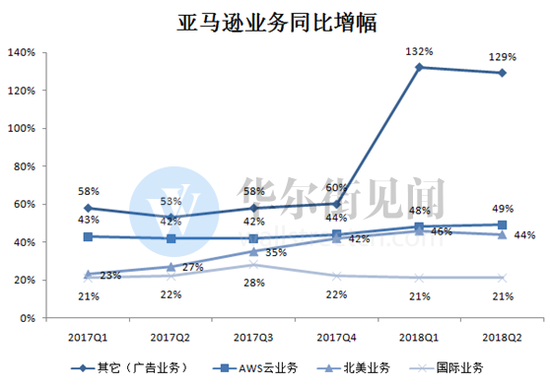 亚马逊2018年二季度财报显示,亚马逊的广告业务营业额为22亿美元,同比增长132%;AWS云服务的收入为61亿美元,同比增长49%。而从亚马逊各业务的增速来看,广告和云业务在过去六个季度也处于领先地位。