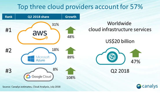 云服务研究权威机构Canalys近期发布的数据显示,今年第二季度云基础设施服务市场中,亚马逊依然保持着第一的位置,但占比轻微下降至31%。而微软云服务Azure二季度暴增89%,市场占有率上升到18%,同比增长4个百分点;谷歌云二季度收入更是暴涨108%,市场占有率也上升到8%。可以看出,在云服务领域,竞争对手正在紧追亚马逊。