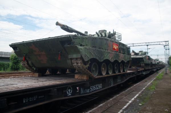 1军装甲旅的04A步兵战车正在通过铁路机动