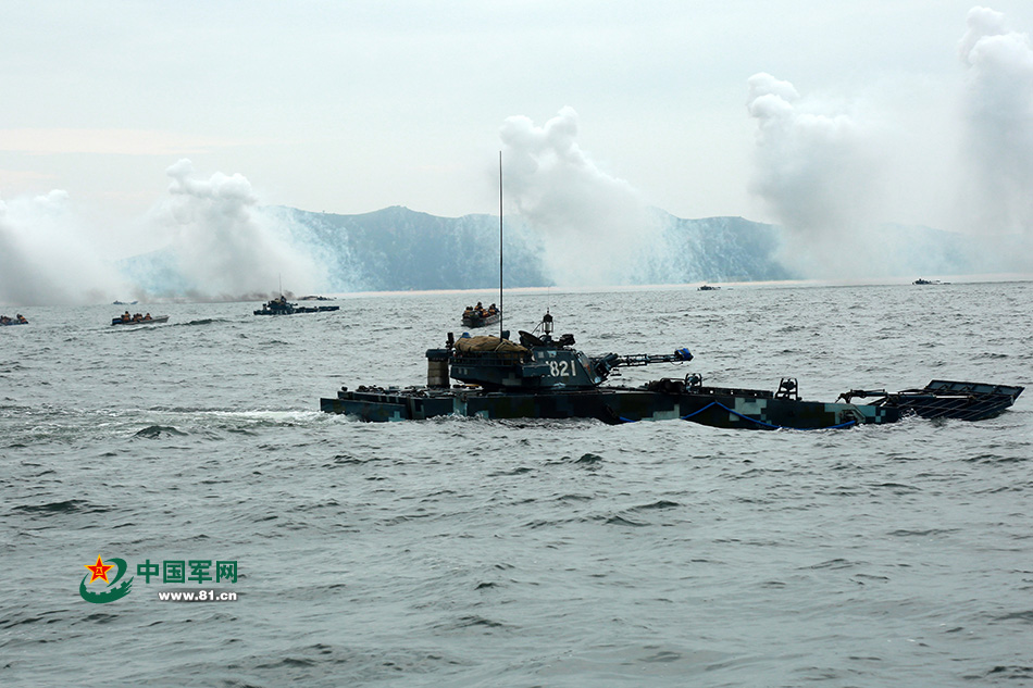 7月12日,海军陆战队某旅组织加强两栖装甲步兵连登陆进攻演练。连日来,该部按照实战要求,组织部队在南海某海域开展作战指挥、兵力协同、火力打击等演练,进一步提高部队作战能力。图为两栖装甲车利用烟雾快速抢滩。