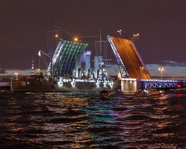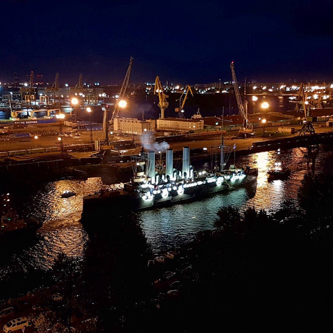 “阿芙乐尔”号花了数小时,从喀琅施塔得造船厂回到了彼得格勒的岸边,成千上万的市民和游客在此欢迎她的归来。甲板上,船员们一字排开进行站坡仪式。灯光辉映,“阿芙乐尔”号回来了。