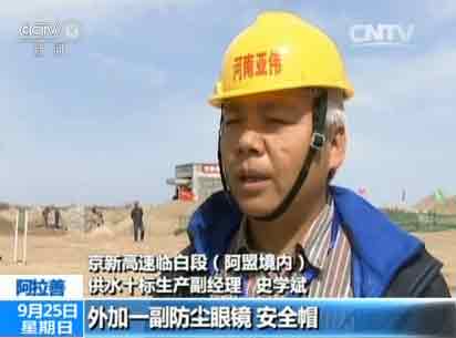 京新高速临白段阿盟境内供水十标生产副经理,史学斌:工地上每人一个防尘脖套,外加衣服防尘眼镜,安全帽,因为风沙太大,在作业现场,眼睛睁不开。