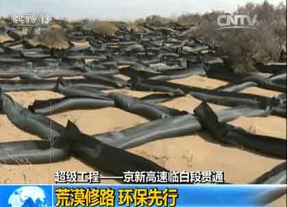 巴丹吉林沙漠位于阿拉善盟境内,占地面积4.43万平方公里,是内蒙古面积最大的沙漠。而京新高速额济纳段需要穿过巴丹吉林沙漠近40多公里的路程, 因为沙漠的沙土较细且流动性强,针对这种特殊的地质条件,施工人员专门设计了填充式的防风沙袋,利用填充好的沙袋对沿线的沙土起压覆的作用还可以循环再利用。防风沙带由一个个一平方米的小方格组成。为了防风固沙,沙袋进行了独特设计,采用耐寒耐晒的材质,至少可以保持20年。而且这种鳍状防沙袋不但能减缓风速,还能把吹起的沙留在框格起到固沙作用。