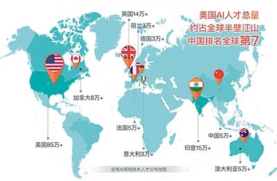 据领英近日发布的《全球AI领域人才报告》显示,截至2017年一季度,基于领英平台的全球AI(人工智能)领域技术人才数量超过190万,其中美国相关人才总数超过85万,高居榜首,而中国的相关人才总数也超过5万人,位居全球第七。