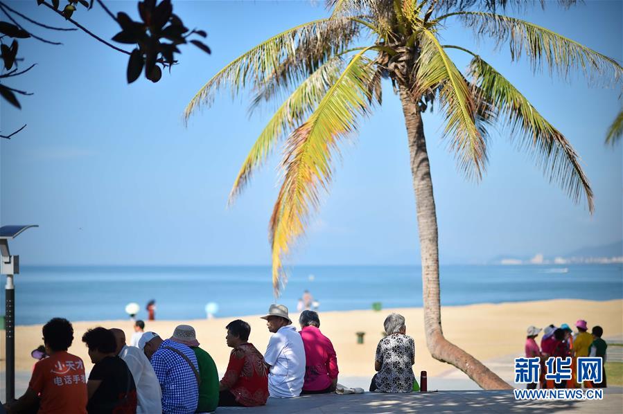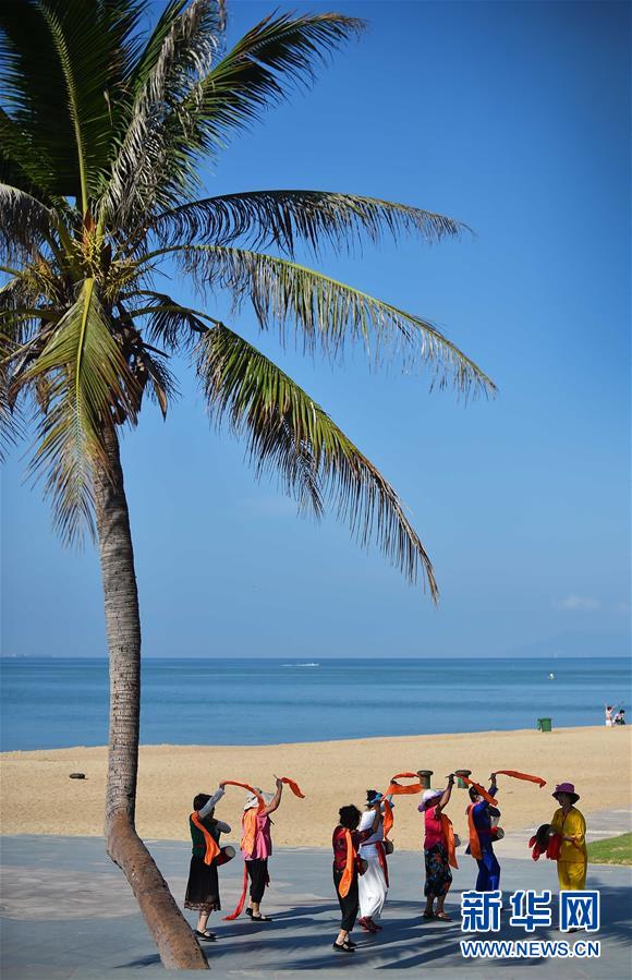 10月28日,老人们在三亚湾跳舞。随着北方天气逐渐变冷,众多老年人开始了一年一度的“南飞”。在海南省三亚市,越来越多的“候鸟老人”来到这里享受阳光、沙滩、椰林。新华社记者 郭程 摄