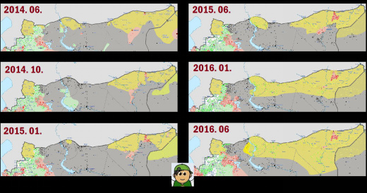 叙利亚库尔德区(黄色)从2014年6月“伊斯兰国”大举进攻开始到现在的变化(黑色IS,绿色反对派,红色叙政府区)