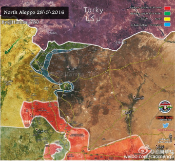 尽管有了美军空袭和土耳其火炮支持,阿勒颇北部土叙边境“自由军”(绿色)还是差点被IS消灭