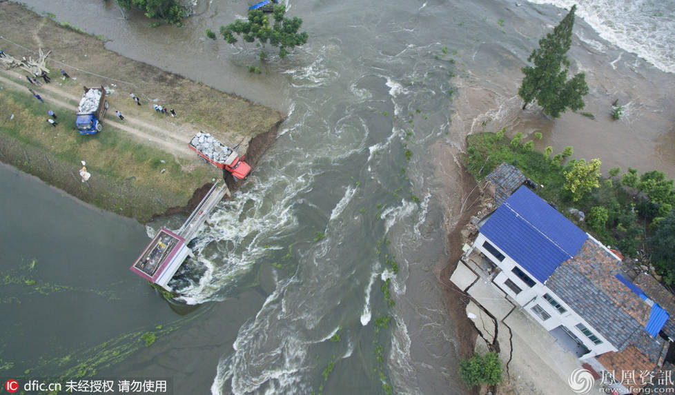 记者昨天下午6时抵达现场时看到,溃口南北两边停放着满载大石头的货车。晚7时19分许,溃口南边的第一辆大货车冲向溃口抵挡洪水。截至晚上8时许,南北两边共有10辆大货车沉入溃口。堵口复堤工作正在紧张进行。