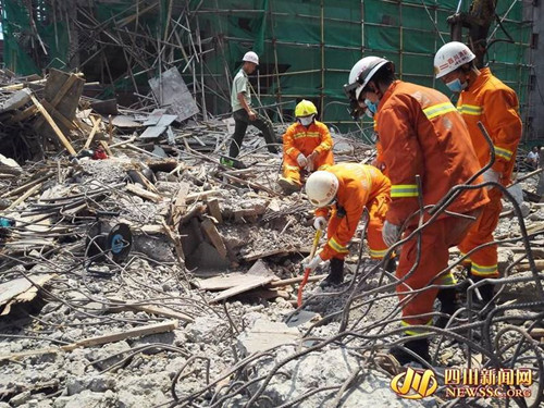 事发后,救援人员正在积极开展施救。参与救援的人员有50余人,救援人员达到现场后,立即运用搜救犬、生命探测仪、破拆设备、坍塌起吊机等设施设备,全力开展搜救工作。参与救援的相关负责人称,从事发后,救援力量便集中精力开始挖掘,先后找到6名死者尸体。图为由于钢筋混泥土渣滓较多,给救援力量增加了难度,只能用钳子一点一点刨。