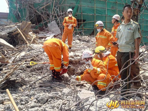 8月22日下午6点半左右,四川省南充阆中市七里新区一商住楼工程在浇筑混凝土时,发生支模架垮塌事故。当时,王友均和另外几名工人正站在楼顶浇筑混凝土,但脚下的支模架毫无征兆坍塌了。截止目前,坍塌事故已造成6人死亡,4人受伤。目前所有伤亡人员家属已经全部核实通知到位,部分伤亡人员的家属已赶到医院,其余人员家属正在赶来途中。图为经过现场挖掘,救援人员发现失踪者尸体。