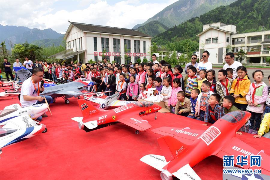5月11日,在四川省绵竹市清平学校,学生们在了解航模相关知识。