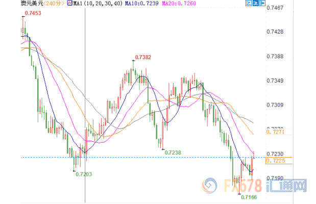短线拉升15点,突破0.72整数关口,后涨幅持续扩大至40点,一度升至0.7235,4小时图MACD在0轴下方形成金叉多头倾向,红色能量柱扩大,RSI也显示金叉多头趋势,短期或将小幅上涨。。