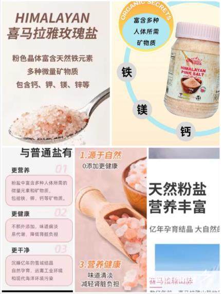 商家常宣传玫瑰盐“含84种微量元素”“无添加”“更健康”,暗示其“既是调料又是营养剂”。并通过牛排撒盐、奶茶调味的场景化视频进行推广。
