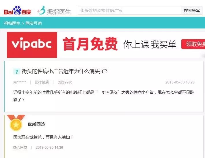 百度拇指医生上,有人问:“为什么街头的性病小广告近年消失了?”