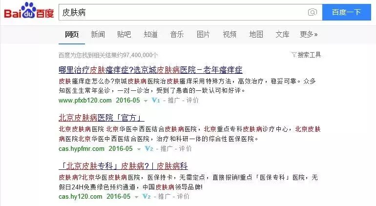 比如,搜索“皮肤病”,前面的都是推广。因为众所周知的事儿,百度已经把大部分的医疗竞价推广暂时取消了。网友有不少截图。