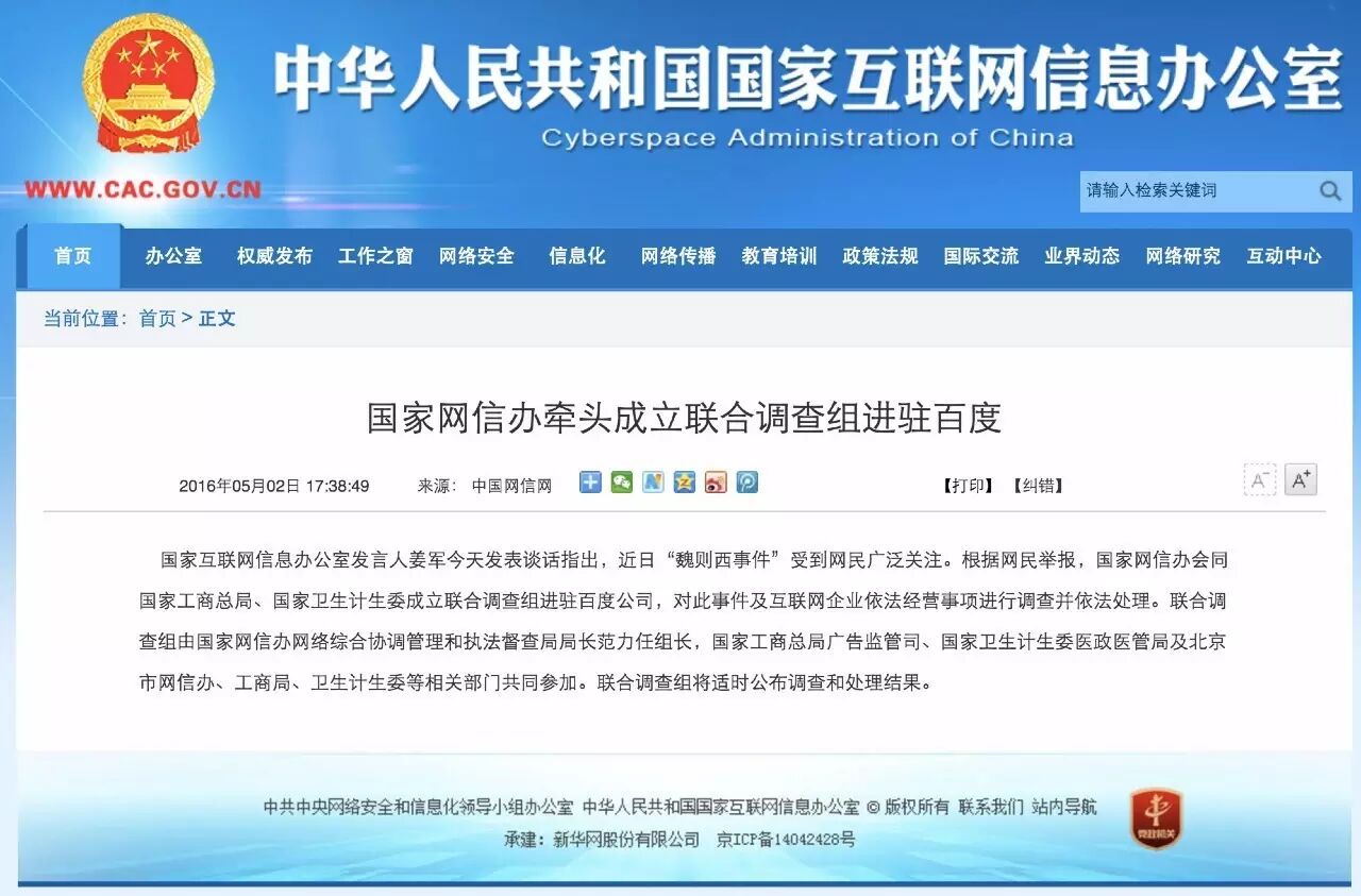 国家网信办5月2日表示,根据网民举报,就“魏则西事件”(21岁的魏则西因罹患罕见病“滑膜肉瘤”去世,他生前曾用百度搜索医疗信息),国家网信办会同工商总局等已成立联合调查组进驻百度公司,对此事件进行调查并依法处理,联合调查组将适时公布调查和处理结果。