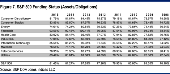 “标普500指数十大板块都存在资金不足的问题,能源板块的情况一直是最严重的。整体而言,标普500强养老金的情况略有改善,但是必须指出的是,500强里,2015年12月时真正资金完全充足的只有30家,其中近一半都是来自金融板块。”