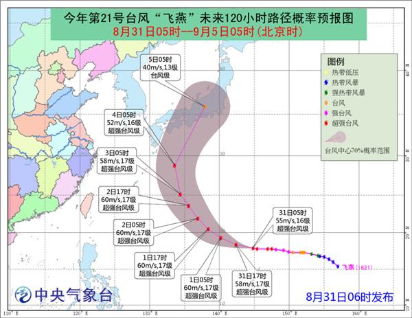 预计,“飞燕”将以每小时22公里左右的速度向西偏北方向移动,强度还将有所加强,9月3日下午将在东经130度以东的洋面上转向偏北方向移动,然后趋向日本本州岛。“飞燕”未来对我国近海无影响。