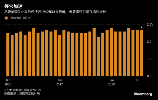 彭博在周五劳工部数据公布之前进行的调查显示,8月非农就业人数料增加19.8万人,失业率料降至3.8%,达到1969年以来最低。7月非农就业人数增加15.7万。平均时薪可能连续第三个月同比上涨2.7%,仅略高于2017年2.5%的平均水平。