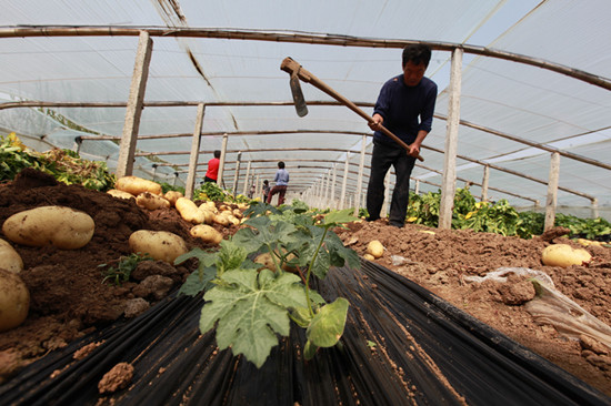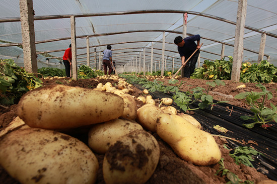 谷雨时节,山东省平邑县地方镇邱上村农民忙碌着采收大棚套种土豆。