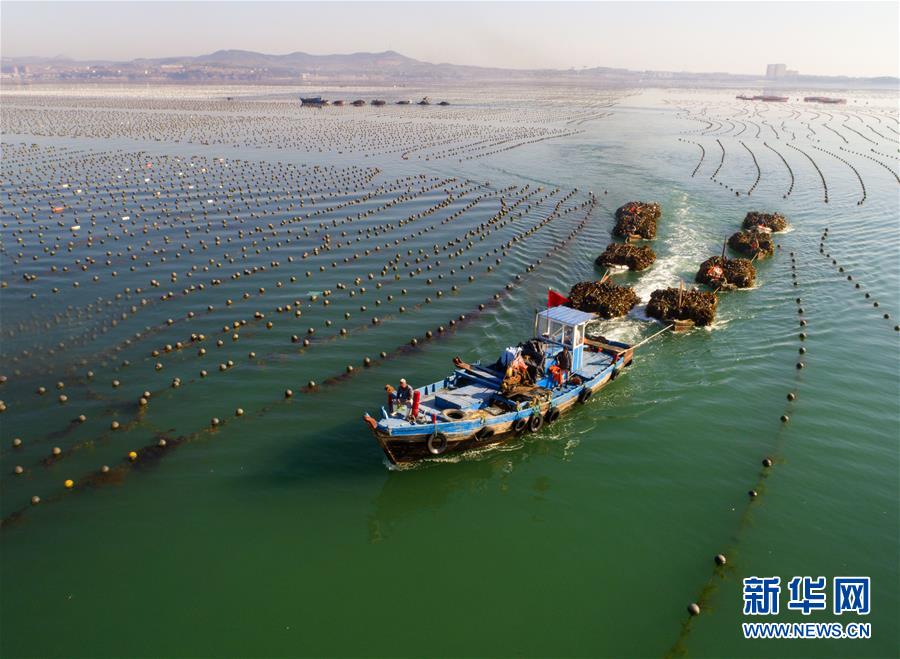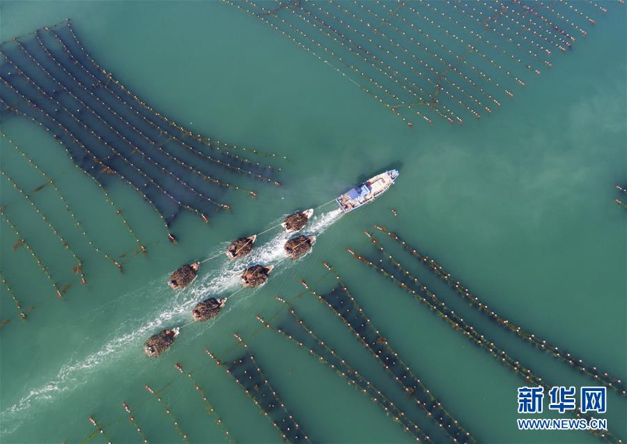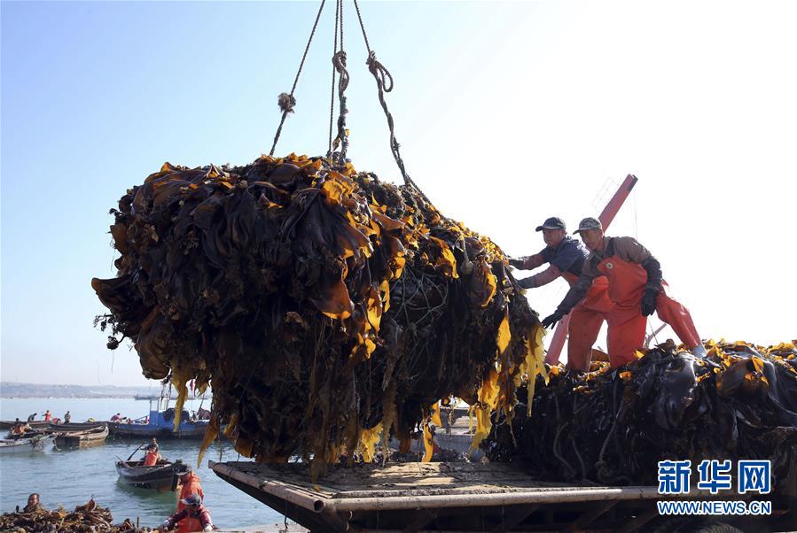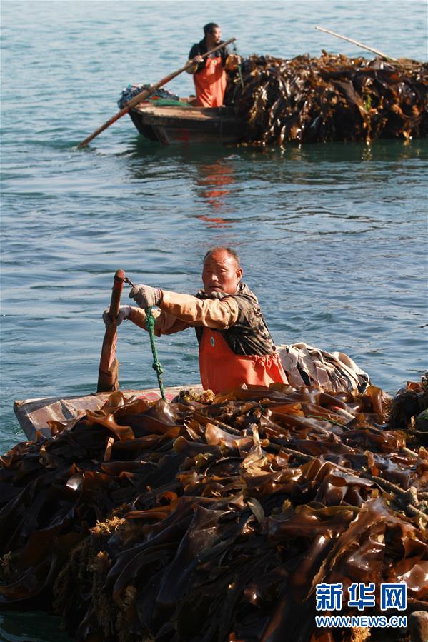 5月16日,在山东荣成一处海带养殖区,养殖工人收割海带。眼下,山东省荣成市各海带养殖企业正抓紧收割海带,沿海养殖区一派繁忙景象。 新华社发(王福东 摄)