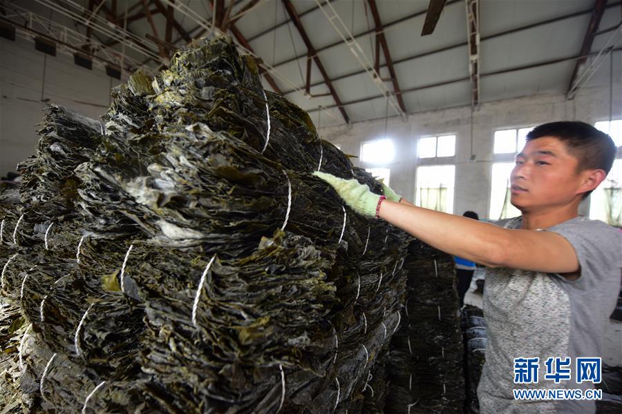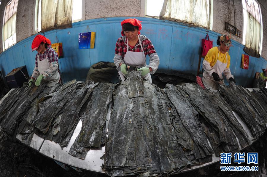 6月5日,在山东省长岛县一海带加工厂,渔民在整理海带。眼下,山东长岛进入繁忙的海带加工期。长岛是山东著名的海带养殖生产基地,海带养殖加工历史悠久。 新华社发(初阳 摄)