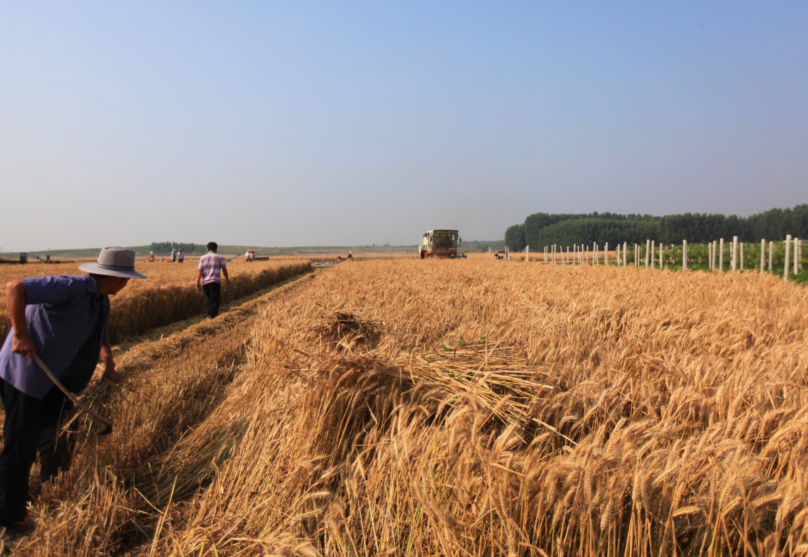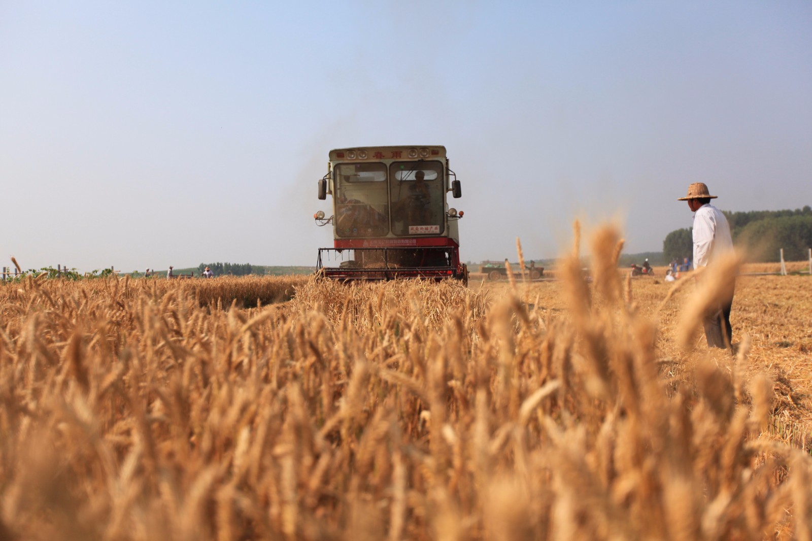 6月11日,收割机在山东省临沂市平邑县地方镇农田里收割小麦。据山东省农机局发布的消息,山东小麦收获进入尾声,玉米机播过八成。截至6月14日下午4点,全省日收获小麦208万亩,累计收获小麦5494万亩,占应收面积的95.3%。武纪全摄