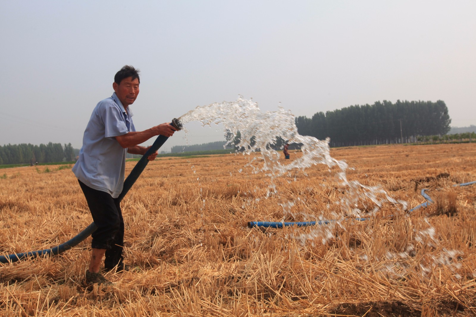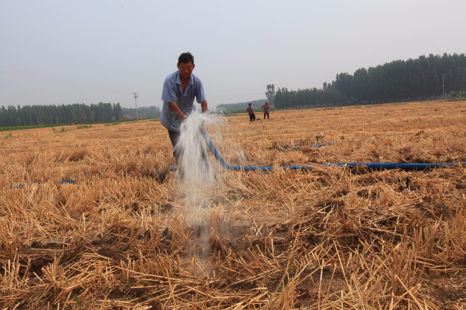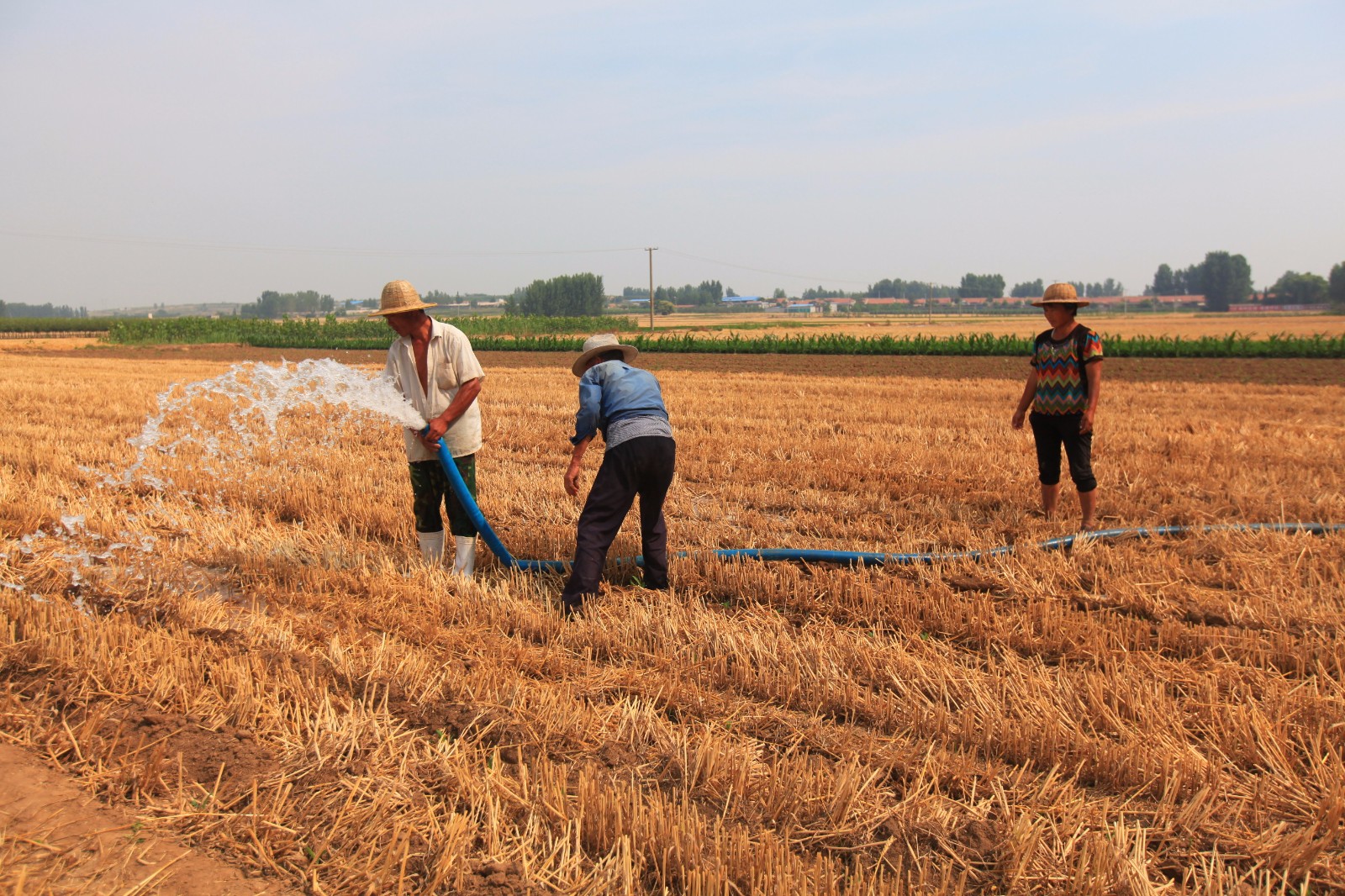 6月21日,在山东省平邑县地方镇大广良村麦茬地里,农民在用喷灌抗旱保夏种。